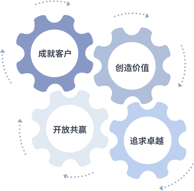 成就客户是一切决策的出发点,创造价值是衡量所有工作的标准,追求卓越是云鼎国际做事做人的态度,开放共赢是云鼎国际的格局也是最终的结果。价值观的齿轮环环相扣,推动着组织里的每个人不断向前。